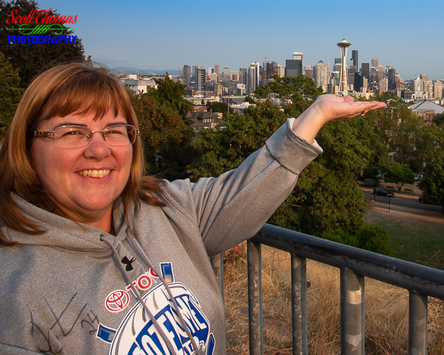 My wife, Merrie, holding the Space Needle in the palm of her hand. Photo of Seattle, Washington taken from Kerry Park on Sunday, August, 12, 2018. Nikon D750/24-120VR, 1/125s, f/16, ISO 560, EV 0, 24mm Focal Length.