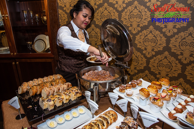 Server scoops out a warm sticky bun during the Palo Brunch on the Disney Dream on Thursday, September 27, 2018. Nikon D750/24-120VR, 1/60s, f/5.6, ISO 400, EV 0, 24mm Focal Length, Bounce Flash.