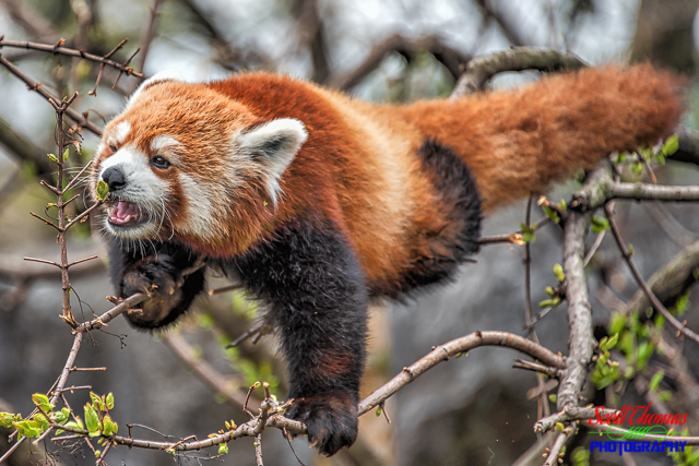 A family favorite, this Red Panda (Ailurus fulgens) was very active seeking out and munching on some Spring greenery inside its enclosure.