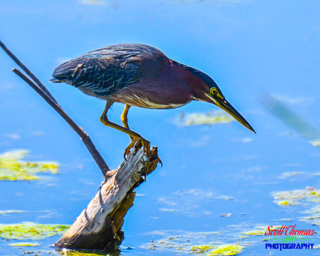 This Green Heron (Butorides virescens) was leaning in for a strike which I missed “by that much”. This bird was not in a good position to the Sun so I switched to Spot Metering.
