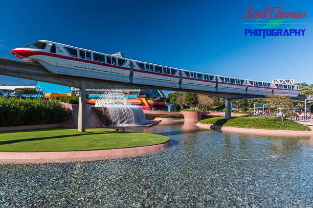 Monorail Red moving past the Journey Into Imagination pavilion in Epcot’s Future World at Walt Disney World, Orlando, Florida. Nikon D750/24-130VR, 1/200s, f/16, ISO 900, EV 0, 24mm Focal Length, Circular Polarizer filter.