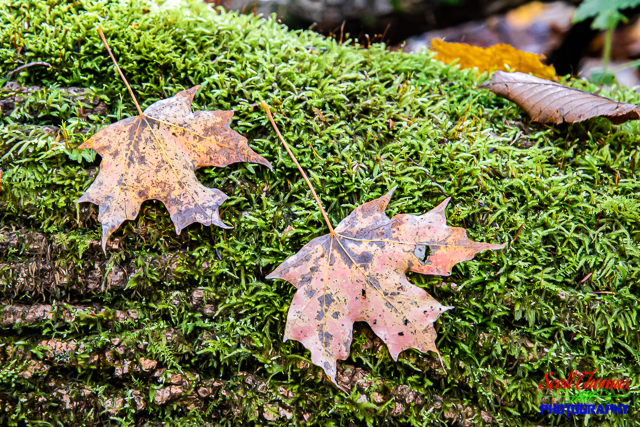 The Deep Woods Trail is a 1.4 mile (2.3 kms) walk which goes just off the lake before looping back through an old growth forest. Along the way I looked for images which said “Autumn” to me. I found it on a moss covered log on the ground as these two maple leaves had fallen on. Here nature is slowly breaking down the log to become future fertilizer for new growth. The leaves indicate a quicker seasonal change from Autumn towards Winter.