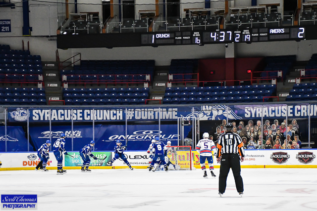 It is an eerie feeling watching AHL games with no fans except for those who put their likeness in the seats as cutouts. It is interesting to hear the players yelling to each other or Officials yelling at the players. The game operations people do pipe in music, sound effects and even crowd noise after the Crunch score a goal but it is not the same.